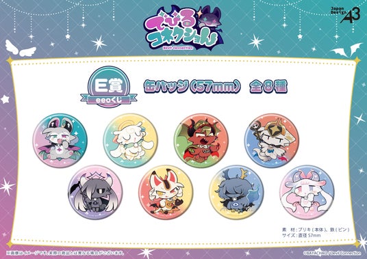 E賞には、定番アイテムの一つである缶バッジ(5.7cm)が登場。でびるんたちの全身姿がデザインされているので、お顔やポーズをぜひお手元でじっくりとご堪能ください!