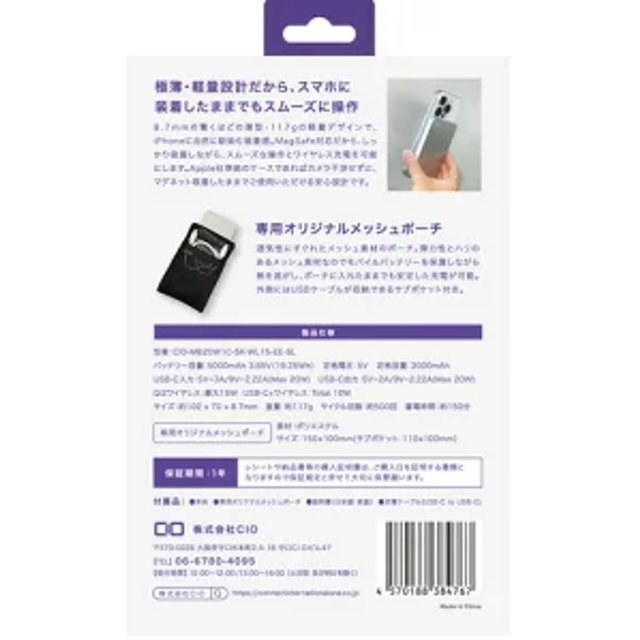 CIOの「SMARTCOBY SLIM 5K Special Edition Set」は、専用メッシュポーチ付きのセット版で、極薄・軽量と機能を両立したモバイルバッテリーです。