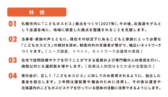 NPO法人ソルウェイズは、2027年札幌市内に「こどもホスピス」拠点をつくります。建物がゴールではなく、当事者・家族、医療・福祉施設や非営利団体、地域の団体や企業等でネットワークをつくり、LTCの子どもと家族の両方を対象として、その地域に合った小児緩和ケア、レスパイトケア、ターミナルケア、家族支援等が行える地域づくり、社会づくりを行います。その活動がこどもホスピスケアであるとソルウェイズでは考え、北海道全体に広がるロールモデルとなるような活動を実施します。