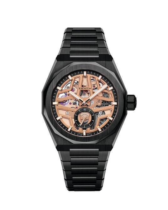大胆なオープンワーク構造を備える「デファイ スカイライン スケルトン」では、コレクションを象徴する1/10秒表示も含め、エル・プリメロのテクニカルなディテールのすべてを眺めることができます。ディープブラックのセラミックケースとゴールドトーンのムーブメントを組み合わせた新たなコントラストは、現代の都市景観を形づくる光の反射と構造物の陰影を彷彿とさせます。
