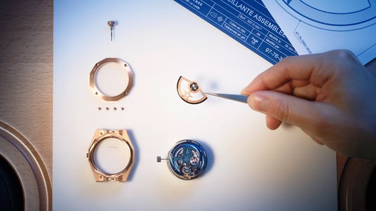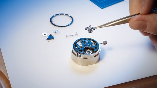 ムーブメントの仕上げは、表面に緻密なハーモニーを奏でています。ブルーPVD加工を施したブリッジと地板は、一部にポリッシュ仕上げを施してロジウムプレート加工の面取りに美しい光の反射を生み出します。5Hzの振動数で動作し、1分で1回転するトゥールビヨンは、高振動の回転によって時計に生きた鼓動を授けています。スケルトン化された香箱は、ゼンマイが50時間のパワーリザーブを通じてほどけていく様子を眺めることができます。