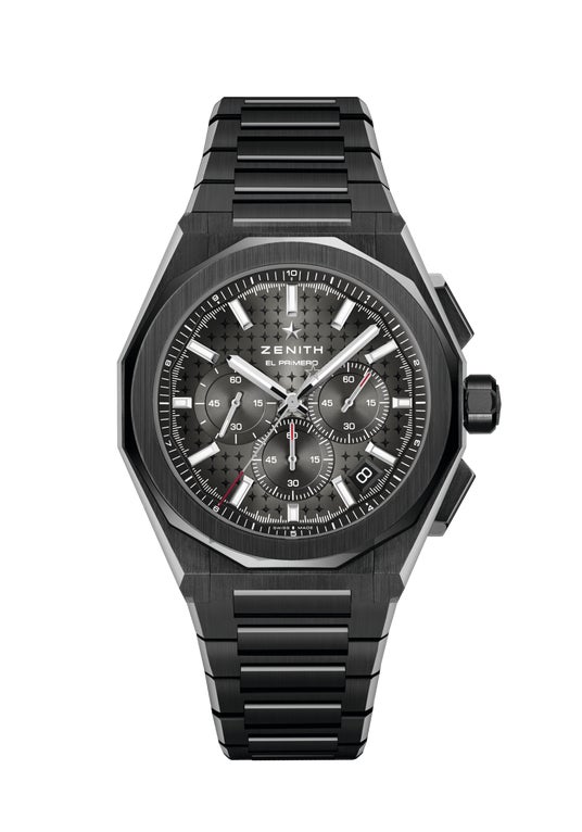 特長:ブラックセラミック製。1/10秒の計測と表示が可能な自動巻エル・プリメロ コラムホイール クロノグラフ。日付表示。シリコン製のアンクルとガンギ車。ねじ込み式リューズ。交換可能なストラップシステム。秒針停止機構。
