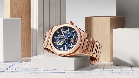 透明感そのものが構造となり、機構の複雑性が建築的な存在感を醸し出す「デファイ スカイライン トゥールビヨン スケルトン」は、コレクションに新たな章を書き加えます。「デファイ スカイライン」コレクション初のトゥールビヨンを搭載したスケルトンモデルは、全体をスケルトン化したエル・プリメロ ムーブメントを収めるローズゴールドケースのファセットが光を捉えて反射を生み出します。