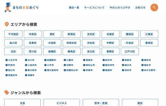 エリアから探す、ジャンルで探すなど、目的に合わせて“まちの本屋”を検索できます。