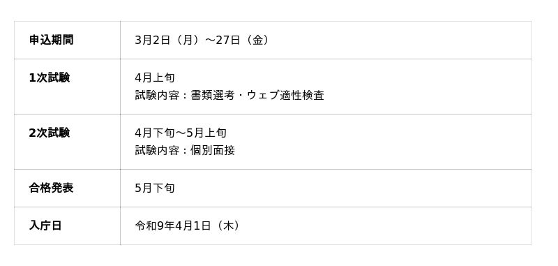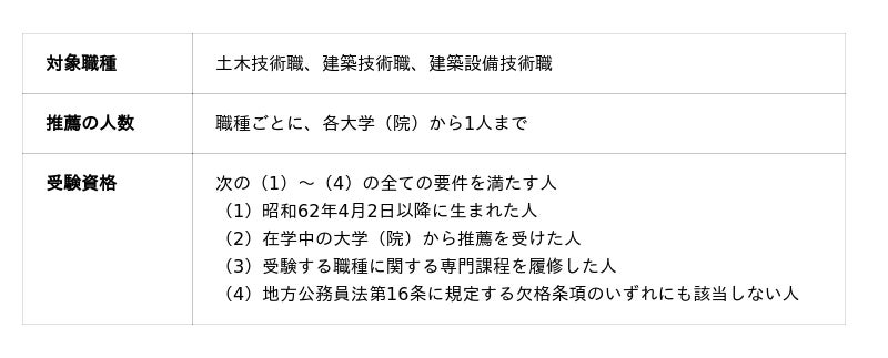 ・推薦の対象大学(院)の指定はありません。・第1次試験は書類選考とウェブ適性検査を実施します。公務員試験および専門試験