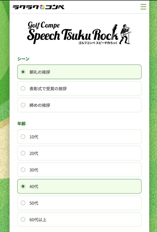「ゴルフコンペ スピーチ作ろっく」は、こうした心理的な負担を解消するために開発されました。AI技術を活用することで、その日の天候やスコア、参加者の顔ぶれに合わせた「あなただけの心温まるスピーチ」をラジオボタンを選択するだけの直感操作で作成します。