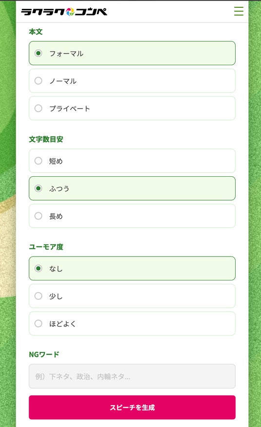 また、スピーチ時間や役割に合わせた文章量の調整、NGにしたいワードの設定も可能です。