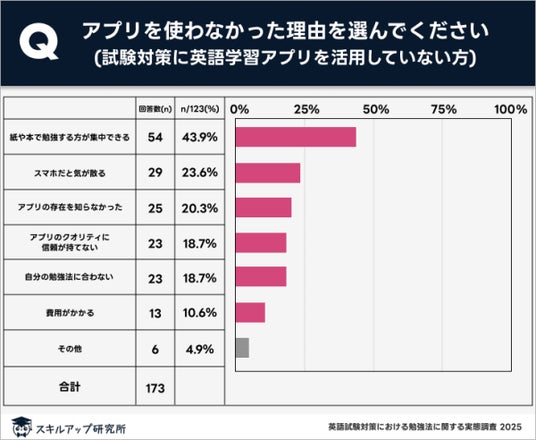 試験対策に英語学習アプリを活用していない人を対象に、「アプリを使わなかった理由を選んでください。」との質問を行うと、「紙の方が集中できる(43.9%)」や「スマホだと気が散る(23.6%)」といった、学習環境の質を重視する回答が上位を占めた。