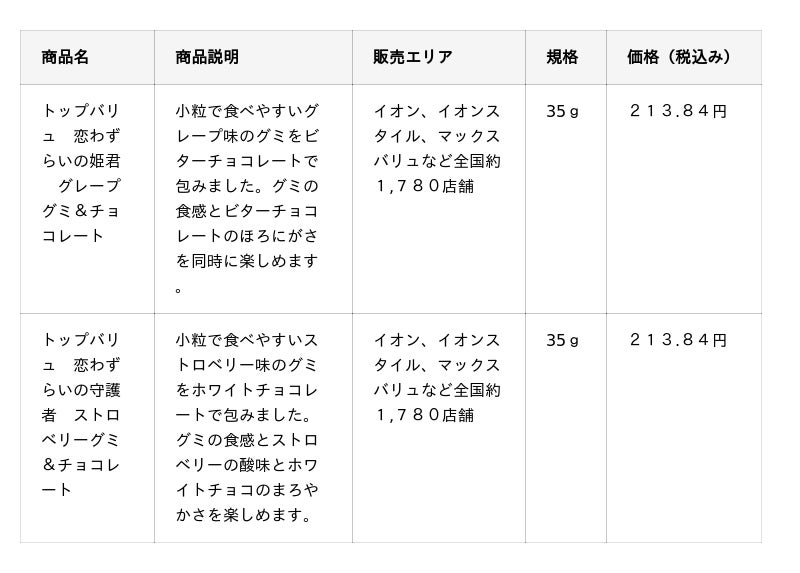 本商品は、「グミ」と「チョコレート」を組み合わせた商品です。グミをチョコレートで包むことで、グミの弾力とチョコレートならではの甘みやなめらかな口どけを一度に楽しめます。2026年1月20日(火)から全国の「イオン」、「イオンスタイル」、「マックスバリュ」で販売されます。