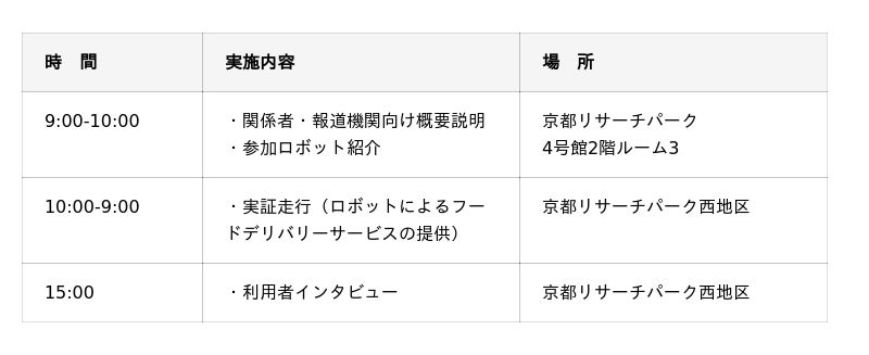 また、有望なユースケースの1つであるフードデリバリーを京都リサーチパーク地区にて実際に提供することにより、サービスの有用性・実現性を検証します。