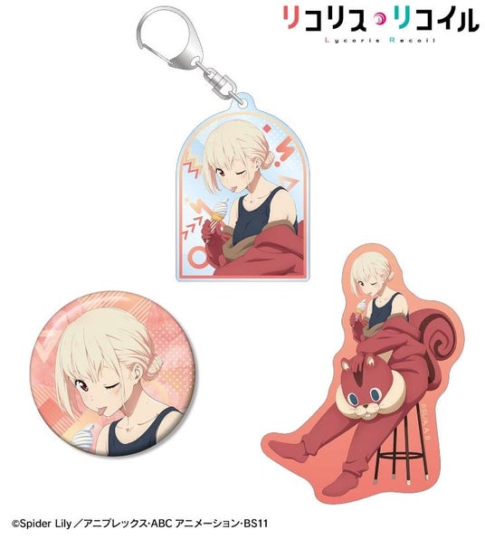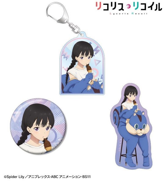 錦木千束、井ノ上たきなの描き下ろしイラストを、キーホルダー・缶バッジ・ステッカーの3点セットにまとめ、プレゼントやお土産にも使えるセットに仕上げました。