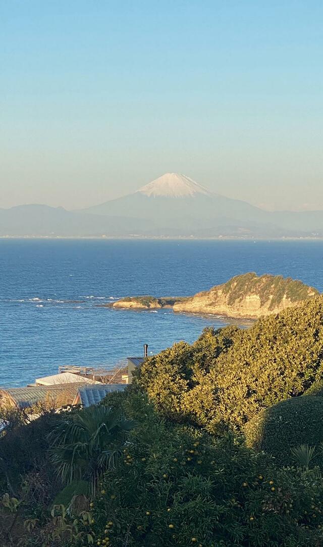 富士山、ぼんやりと姿を表す。きな粉ヨーグルト、プロテイン、紅茶。
