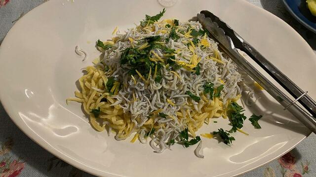釜揚げしらすの生パスタ(ごっそりニンニク入れました)、イタリアンパセリもいっぱい、最後にレモンの皮をパラパラ(基本はRegaloレシピ)。これ。うまい。simple is bestとはこんなこと?
