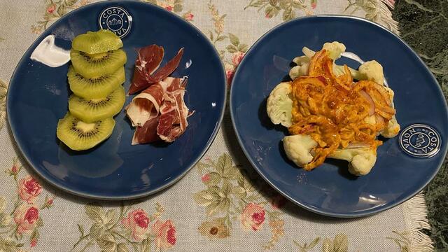 イベリコハムとキウイ、カリフラワーとHarrissa(ウッチイさんの手作り。ハッリッサとマヨネーズを混ぜただけなのに異国情緒が出現。美味しい)ありがとう。
