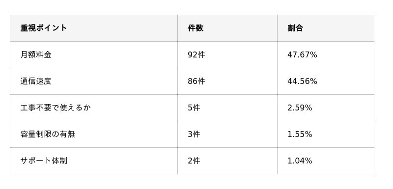 本調査で回答数が多かった上位5項目を抜粋すると「料金」「速度」「工事の有無」「容量制限の有無」「サポート体制」の回答数が多く見られました。