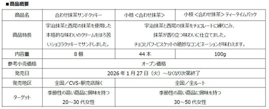 森永製菓株式会社(東京都港区芝浦、代表取締役社長COO・森 信也)は、宇治抹茶と西尾の抹茶を使用した“合わせ抹茶”の新商品「小枝<合わせ抹茶>」2品と「合わせ抹茶サンドクッキー」を、1月27日(火)より全国で期間限定発売いたします。