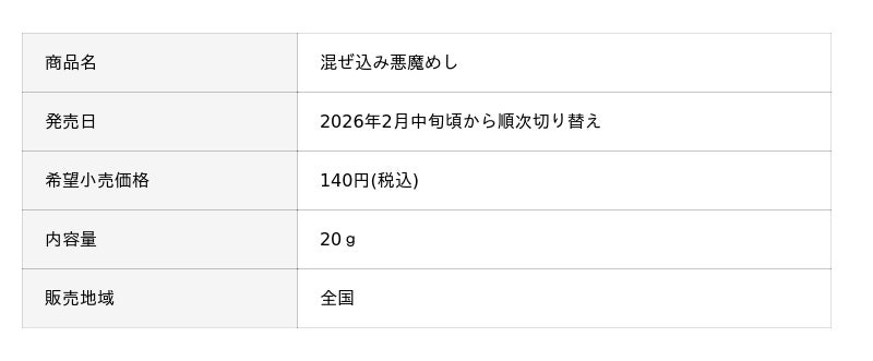 2018年頃の悪魔のおにぎりブームから、家庭で簡単に作れる混ぜ込みタイプのふりかけとして「混ぜ込み悪魔めし」を2019年8月に発売、2026年には発売7周年を迎えます。健康志向の流れがある一方で、昨今の食トレンドとして「悪魔系レシピ」「ギルディフード」「背徳グルメ」といった″あえて罪深いおいしさ“を楽しむ傾向が、今も根強く続いています。