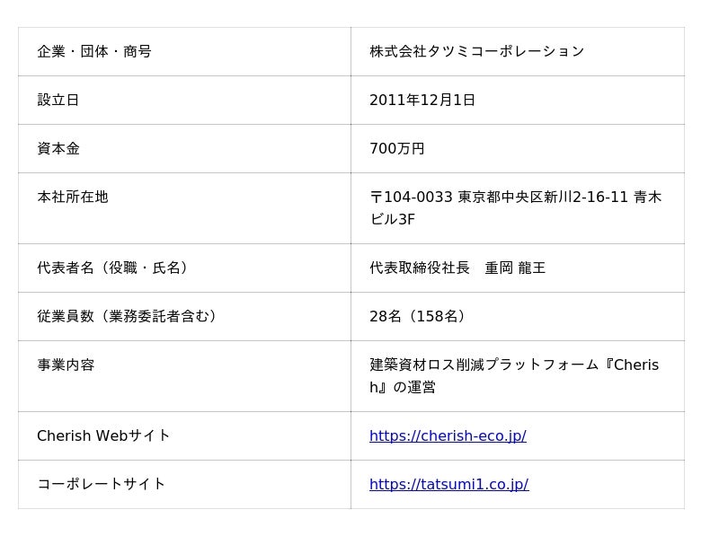株式会社タツミコーポレーション(本社:東京都中央区、代表取締役:重岡龍王)が運営する建築資材マッチングサイト『Cherish(チェリッシュ)』は、この社会課題を解決するため、全国的な認知拡大を目的としたクラウドファンディングプロジェクトをCAMPFIREにて開始しました。