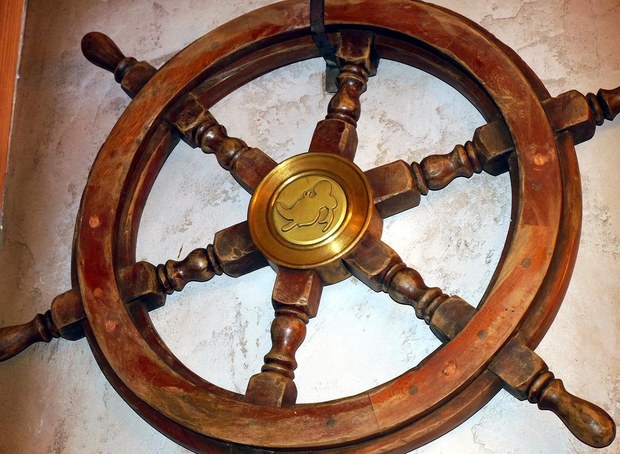 この左上には、船の「舵」があるのですが、真ん中の金属部分をよく見てみると……?