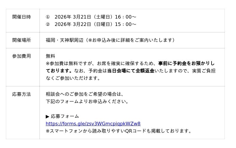 2026年3月21日(土)・22日(日)の2日間、福岡・天神エリアにて無料相談会を開催いたします。