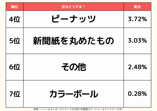 豆のかわりに「新聞紙を丸めたもの」「カラーボール」と答えた家庭もおり、誤飲防止や掃除のしやすさなど、安全性・後片付けへの意識が選択に反映されている様子がうかがえます。
