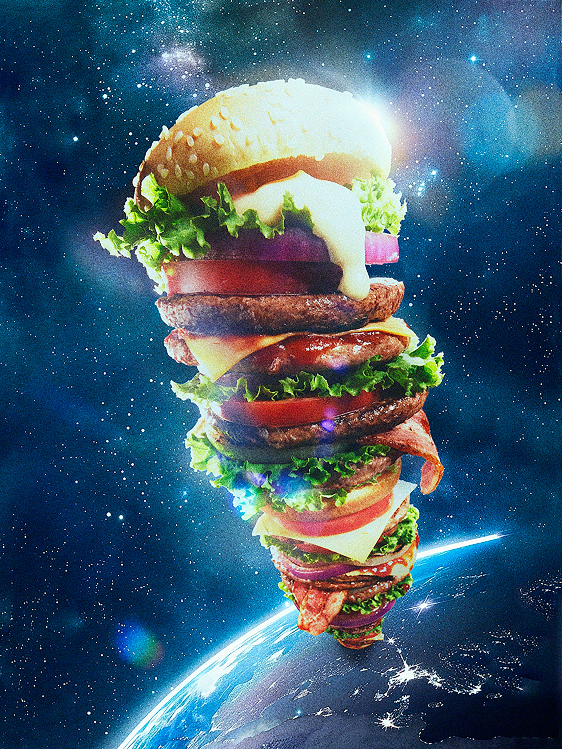 宇宙に届くほど巨大なハンバーガーを通して、広告が抱える“過剰”の美学をあぶり出す作品です。色や形、艶や質感は現実から離れ、過剰なシズル表現はいつしか異空間のリアリティへと変貌します。本作は、大げさに伸びるピザのチーズ、ぐるぐるとフォークに巻き付くパスタとあわせた全3点で構成。誇張は「おいしそう」を増幅させる一方で、どこかで不自然な面白さを感じさせます。「That’s bogus! やりすぎだって!!」という叫びは、広告が表現する快楽と違和感の境界を指し示し、私たちの視線そのものを問い直します。