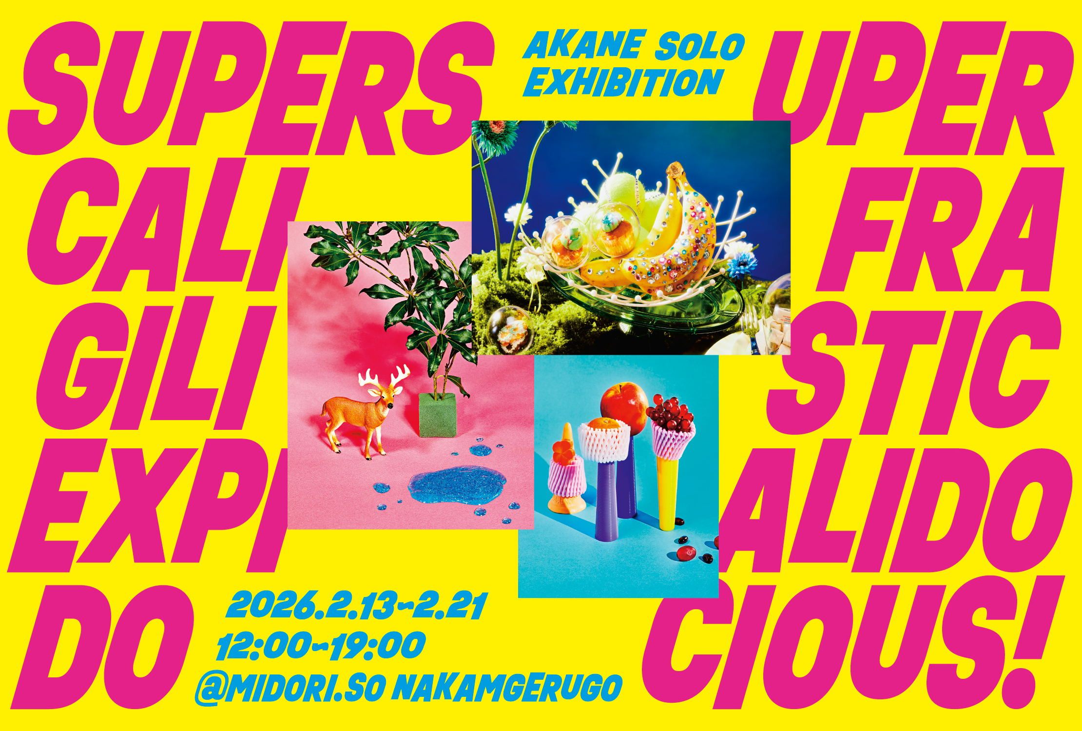 コミュニケーション変革をクリエイティブで実現する株式会社アマナ(本社:東京都品川区、代表取締役社長:金子剛章、以下「アマナ」)所属フォトグラファーAKANEは、写真展『Supersupercalifragilisticexpialidodocious』(スーパースーパーカリフラジリスティックエクスピアリドードーシャス) を、2026年2月13日(金)~2月21日(土)に MIDORI荘 中目黒ギャラリー(東京都目黒区)にて開催します。