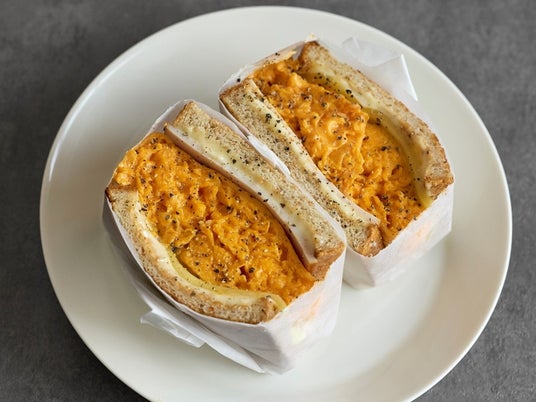 鎌倉ロースハムとチーズのオムレツサンド(1セット・2切)1,699円 オムレツを楽しめるよう薄切りパンを使用。トロトロ卵と塩味控えめなチーズ、ハムとのバランスが調和し、ボリュームも満点です。