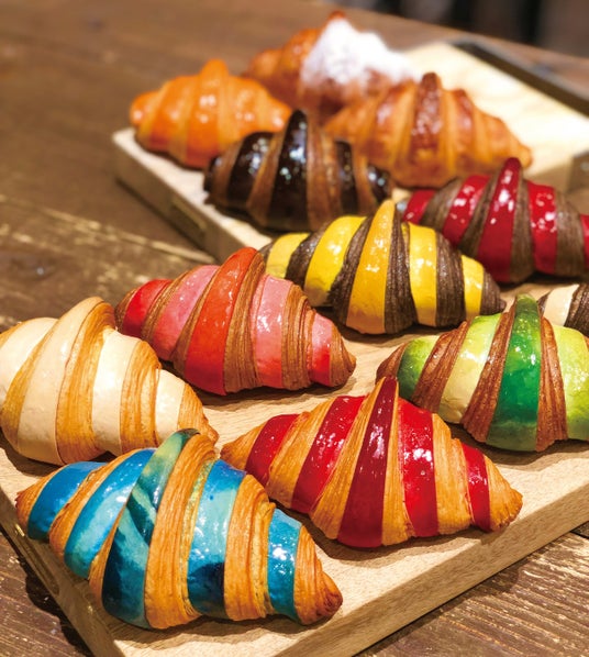 バイカラークロワッサン各種(各1個) 601円 映え間違いなしの、カラフルにデコレートされたクロワッサン。小麦粉やバターなど、素材にもこだわり抜いた上質なあじわいです。