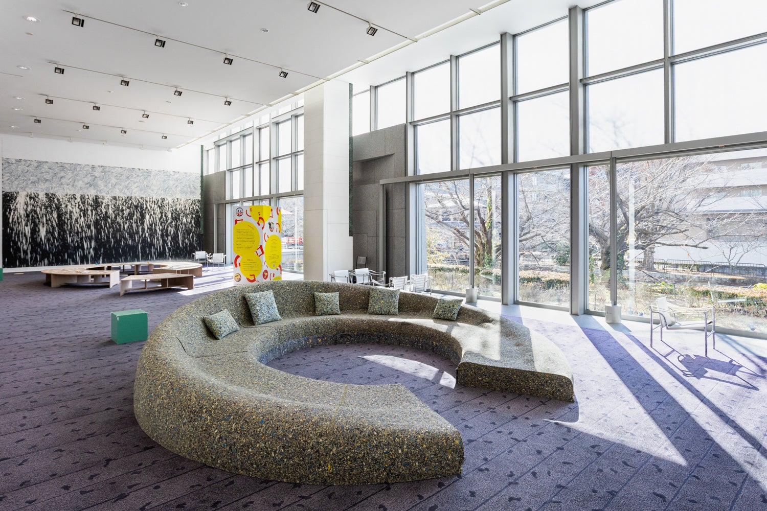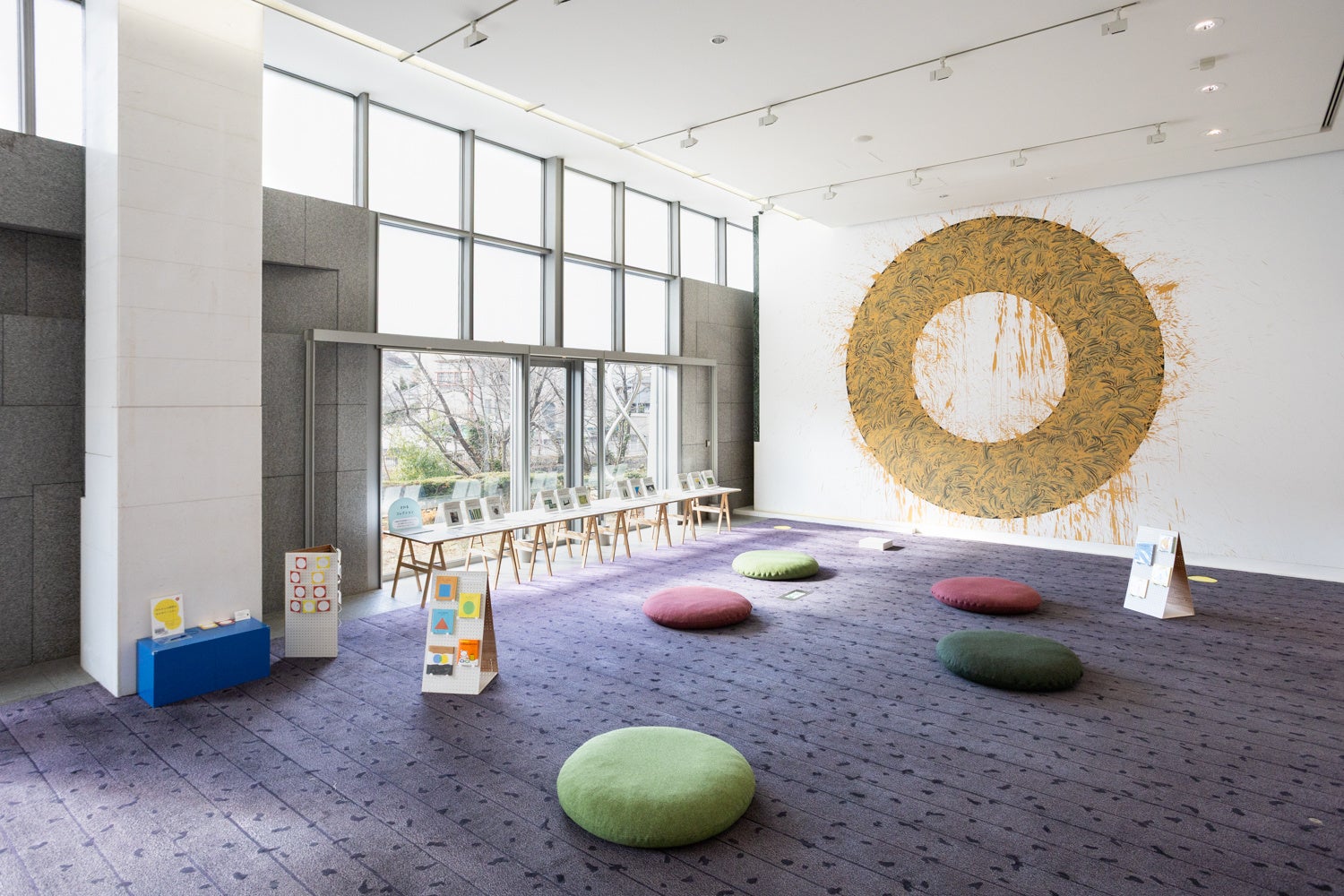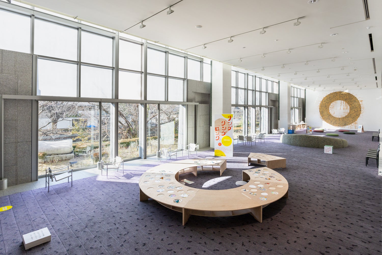 琵琶湖疏水に面した美術館1階のロビーは、いつでもだれでも訪れることができるフリーゾーンです。壁にはイギリス人作家のリチャード・ロングが1996年に描いた大きな作品があり、訪れる人たちをいつも出迎えています。