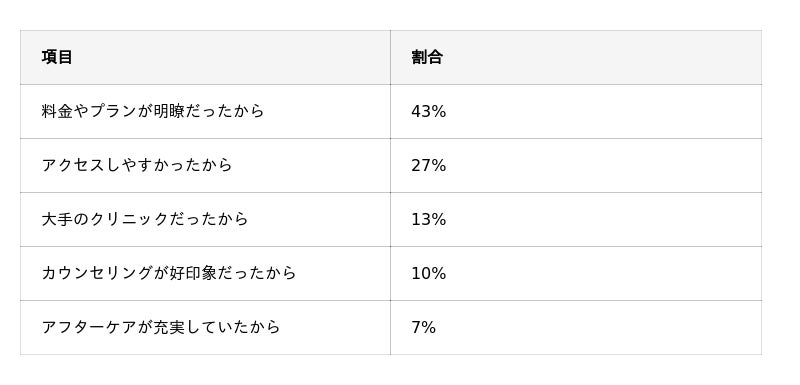 クリニックを選んだ決め手を「料金やプランが明確だったから」(43%)と答えた人が最多でした。