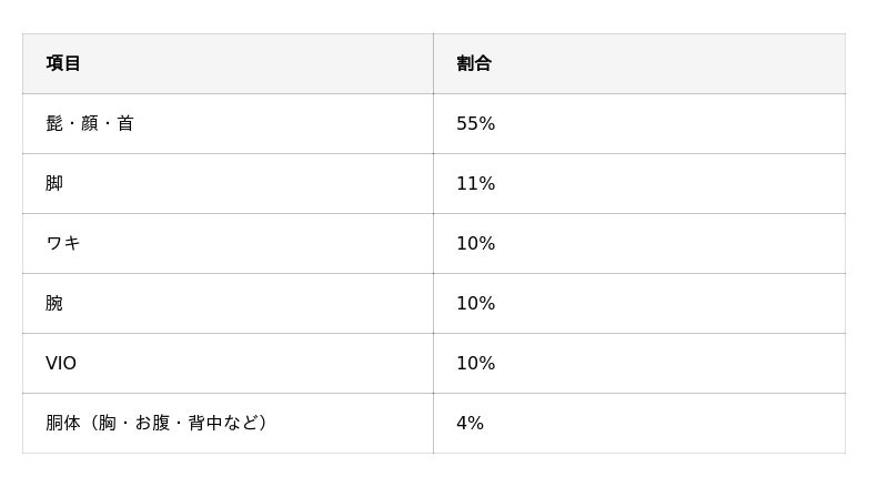 「脚」(11%)や「ワキ」(10%)と比べても割合が高く、部分脱毛の中でも特に選ばれている部位であることが分かります。
