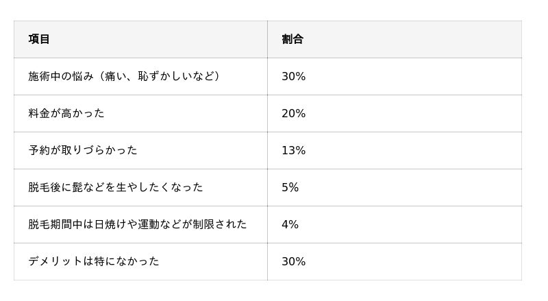- 施術のデメリットは、「施術中の悩み(痛い・恥ずかしいなど)」(30%)が最も多い