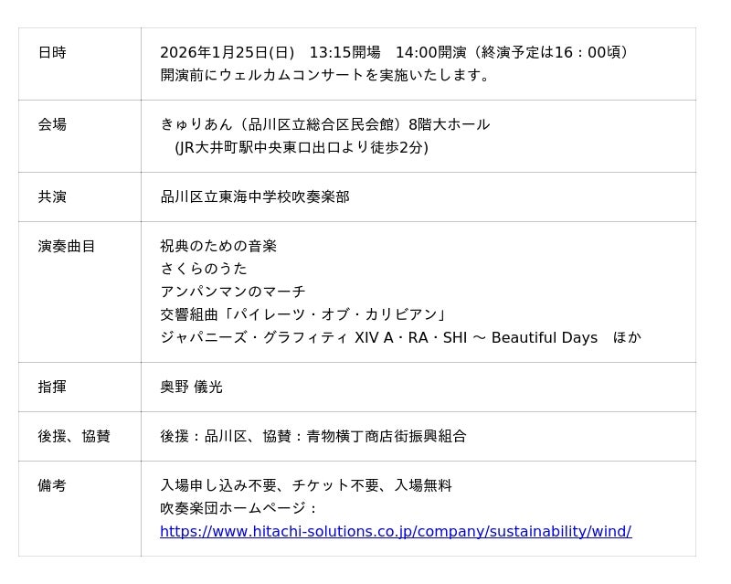 株式会社日立ソリューションズ(本社:東京都品川区、取締役社長:森田 英嗣/以下、日立ソリューションズ)は、地域社会への貢献の一環として、吹奏楽団による第38回定期演奏会を1月25日(日)に開催します。