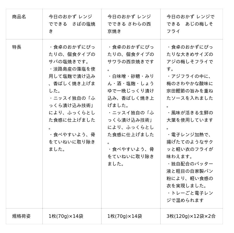 株式会社ニッスイ(代表取締役 社長執行役員 田中 輝、東京都港区)は、ご家庭の食卓に向けた惣菜を揃えた「今日のおかず」シリーズ(家庭用冷凍食品)の新商品として、「今日のおかず レンジでできる さばの塩焼き」「同 さわらの西京焼き」「同 あじの梅しそフライ」の3品を3月1日に発売します。人気の“焼き魚”や“魚のフライ”が、電子レンジであたためるだけで手軽に召しあがれる商品です。