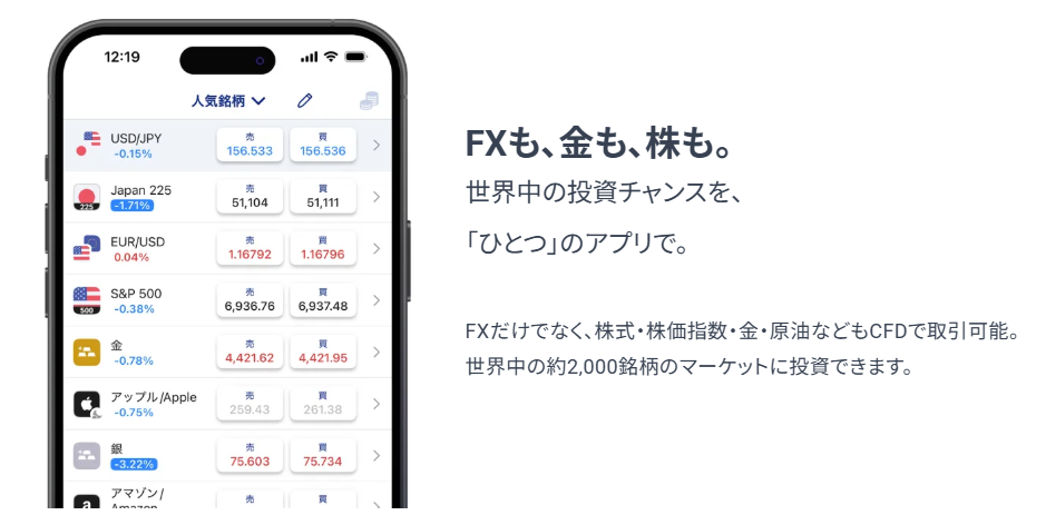 FX、株式CFD、商品CFDなど、複数の金融商品の価格を1つの画面でまとめて確認。アプリの使い分けは不要で、世界の金融市場へシンプルにアクセスできます。