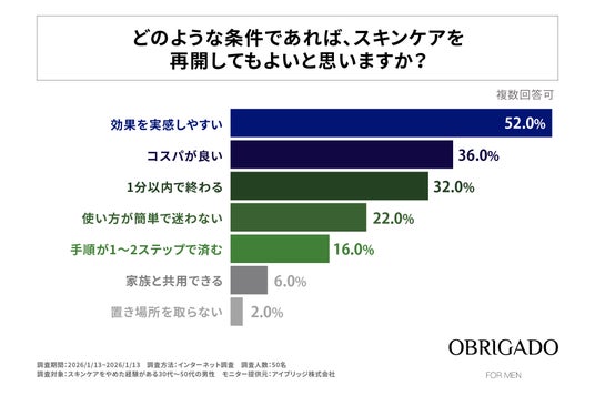 さらに、再開条件としては「効果を実感しやすい(52%)」「コスパが良い(36%)」「1分以内で終わる(32%)」が上位に挙がり、「手間をかけずに、きちんと効果を感じたい」というニーズが非常に強いことが分かりました。