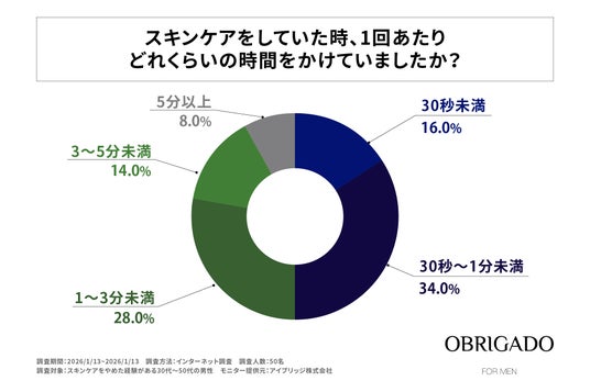 スキンケアにかけていた時間は、「30秒~1分未満(34%)」「30秒未満(16%)」と、1分未満が合計50%を占めました。