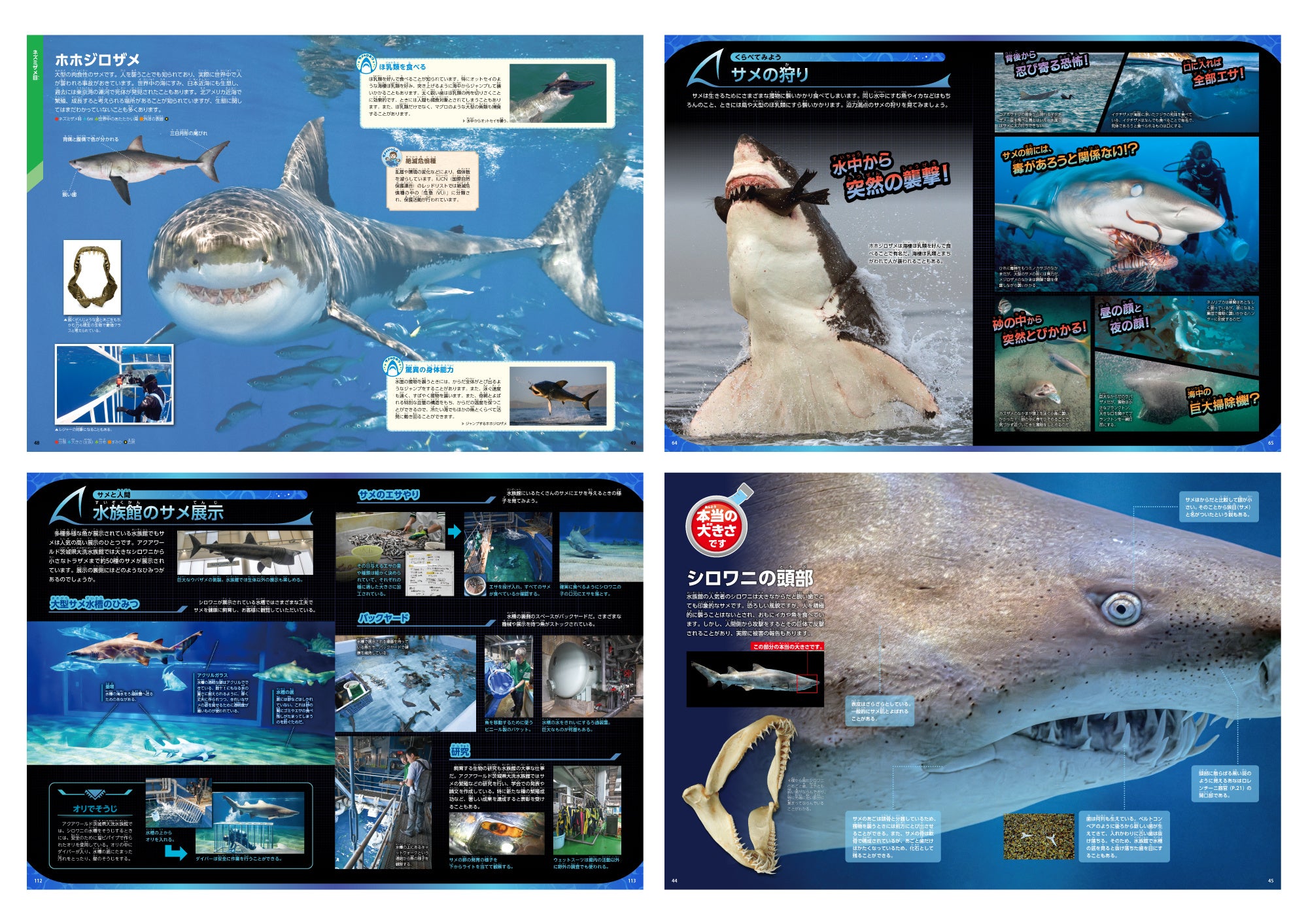 『学研の図鑑LIVEエクストリーム サメ』は、1冊まるごとサメを掘り下げる図鑑です。獰猛なもの、可愛いもの、深海にすむものなど……約100種もの多様なサメたちが大集合しました。歯、感覚器、繁殖、古代ザメなど、多方面からサメの“海の王者”たる所以を完全解説しています。また「サメの飼育種類数日本一(約60種)」で知られる「アクアワールド茨城県大洗水族館」の完全バックアップにより、大迫力の実物大撮りおろし写真や、バックヤードの情報も収録。サメの多彩な魅力がつまった、かつてない図鑑です。