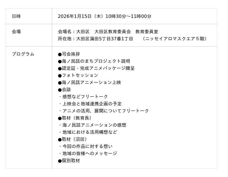 一般社団法人日本昔ばなし協会と日本財団が取り組む「海ノ民話のまちプロジェクト」は、東京都大田区を舞台にした海ノ民話アニメーション「海苔の起源」が完成したため、1月15日(木)にアニメ監督が大田区を訪問し、アニメのお披露目と「海ノ民話のまち」認定式を実施しました。このイベントは、次世代へ豊かで美しい海を引き継ぐために、海を介して人と人とがつながる“日本財団「海と日本プロジェクト」”の一環で実施しています。