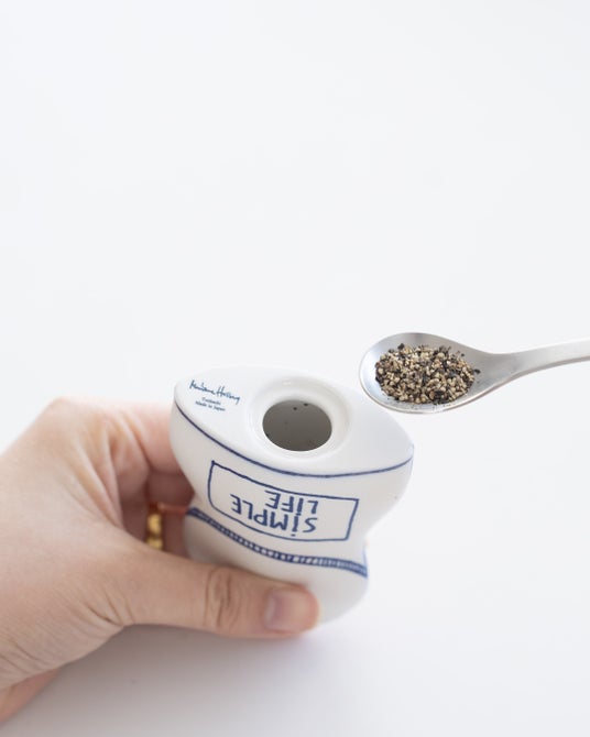 マリアンヌのジャパンシリーズより、嬉野肥前吉田焼の窯元で制作されたソルト&ペッパー。一つ穴の塩入れには「DREAMS & iLLUSiONS」、三つ穴の胡椒入れには「SiMPLE LiFE」。それぞれに、マリアンヌの言葉が刻まれています。底の栓を外して、塩や胡椒を補充することができます。