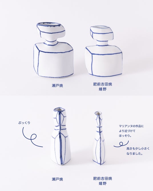 マリアンヌの原型は、日本の職人さんの元に届けられ、彼らの手により日本的な技巧と洒脱が加わることで、にっぽんのマリアンヌが完成します。今回の窯元さんの拠点は佐賀県嬉野市。我々マリアンヌチームは「うれしの」の地名に過敏に反応せずにはいられません。ここに、「日本のうれしいマリアンヌ」の始まりを高らかに宣言いたします!(特集サイトより)