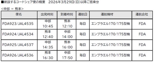 株式会社フジドリームエアラインズ(本社:静岡県静岡市、代表取締役社長:本田 俊介、以下「FDA」)と日本航空株式会社(本社:東京都品川区、代表取締役社長:鳥取 三津子、以下「JAL」)は、2026年3月29日(日)よりFDAが新たに就航する中部=熊本の路線において、JALコードシェア便を設定します。