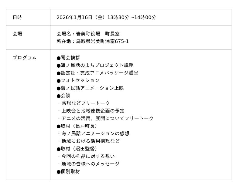一般社団法人日本昔ばなし協会と日本財団が取り組む「海ノ民話のまちプロジェクト」は、鳥取県岩美町を舞台にした海ノ民話アニメーション「海の神様」が完成したため、1月16日(金)にアニメ監督が岩美町を訪問し、アニメのお披露目と「海ノ民話のまち」認定式を実施しました。このイベントは、次世代へ豊かで美しい海を引き継ぐために、海を介して人と人とがつながる“日本財団「海と日本プロジェクト」”の一環で実施しています。