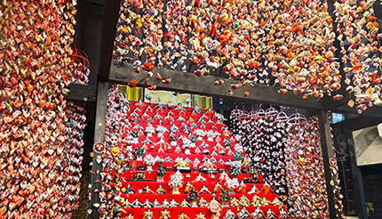 「雛のつるし飾り」は、ひな祭りのときに雛壇の両脇に手作りの人形をつるすという、伊豆稲取温泉の伝統文化。娘の健やかな成長を願い、思いを人形に込めてひな祭りをお祝いする。