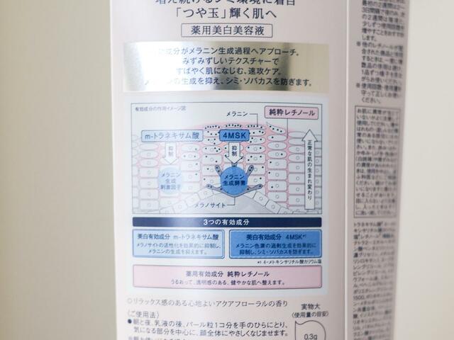 このセラムのすごいところは、薬用有効成分の「純粋レチノール」のほか、資生堂が開発した美白有効成分「m-トラネキサム酸」と「4MSK」が配合されていること!