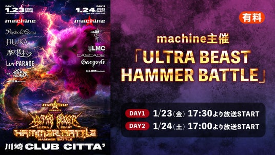 1月23日・24日、川崎クラブチッタにて開催される、machine主催「ULTRA BEAST HAMMER BATTLE」イベントを、チケット制でニコニコ生放送にてお届けします。