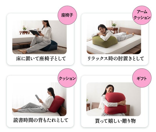 リビングで座椅子としてくつろいだり、寝室でおやすみ前のリラックスタイムに。贈り物としても、おすすめです。