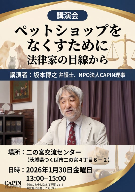 認定NPO法人動物愛護を考える茨城県民ネットワーク(CAPIN/茨城県)は、講演会 「ペットショップをなくすために ― 法律家の目線から」を開催いたします。