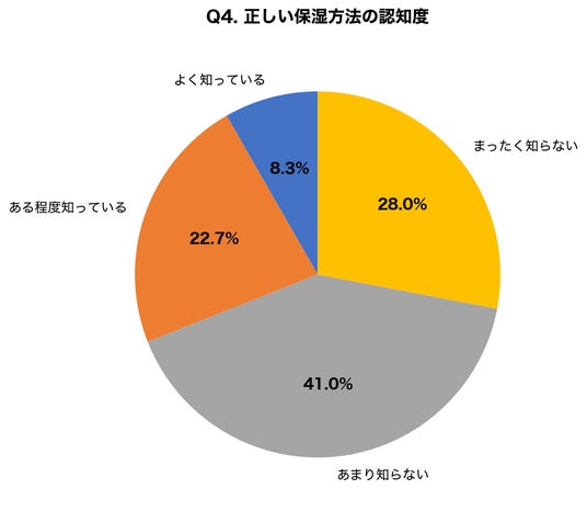 正しい保湿方法を「知っている」と回答した人は31.0%にとどまりました。一方で「あまり知らない」「まったく知らない」を合わせると69.0%に達し、正しいスキンケア知識の普及が課題であることが浮き彫りになりました。